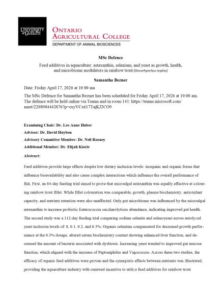 Feed additives provide large effects despite low dietary inclusion levels: inorganic and organic forms that influence bioavailability and also cause complex interactions which influence the overall performance of fish. First, an 84-day feeding trial aimed to prove that microalgal astaxanthin was equally effective at colouring rainbow trout fillet. While fillet colouration was comparable, growth, plasma biochemistry, antioxidant capacity, and nutrient retention were also unaffected. Only gut microbiome was influenced by the microalgal astaxanthin to increase probiotic Enterococcus saccharolyticus abundance, indicating improved gut health. The second study was a 112-day feeding trial comparing sodium selenite and selenoyeast across autolyzed yeast inclusion levels of: 0, 0.1, 0.2, and 0.3%. Organic selenium compensated for decreased growth performance at the 0.3% dosage, altered serum biochemistry content showing enhanced liver function, and decreased the amount of bacteria associated with dysbiosis. Increasing yeast trended to improved gut mucosa function, which aligned with the increase of Peptoniphilus and Vagococcus. Across these two studies, the efficacy of organic feed additives were proven and the synergistic effects between nutrients was illustrated, providing the aquaculture industry with renewed incentive to utilize feed additives for rainbow trout.